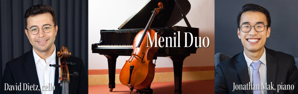 The Menil Duo, consisting of pianist Jonathan Mak and cellist David Dietz, has performed extensively across the USA and Canada and has been prizewinners in major competitions in North America and Europe. In the upcoming 2024-25 season the duo will perform in Texas and across the midwest, including performances at MECA Houston, Lonestar College, and the Ruthmere Concert Series in Elkhart, Indiana. The duo was formed in Houston, Texas and is named after the Menil Collection, an art museum and neighborhood attraction in the heart of Houston. The duo and museum share the same mission: to attract, educate, and inspire diverse audiences through art.